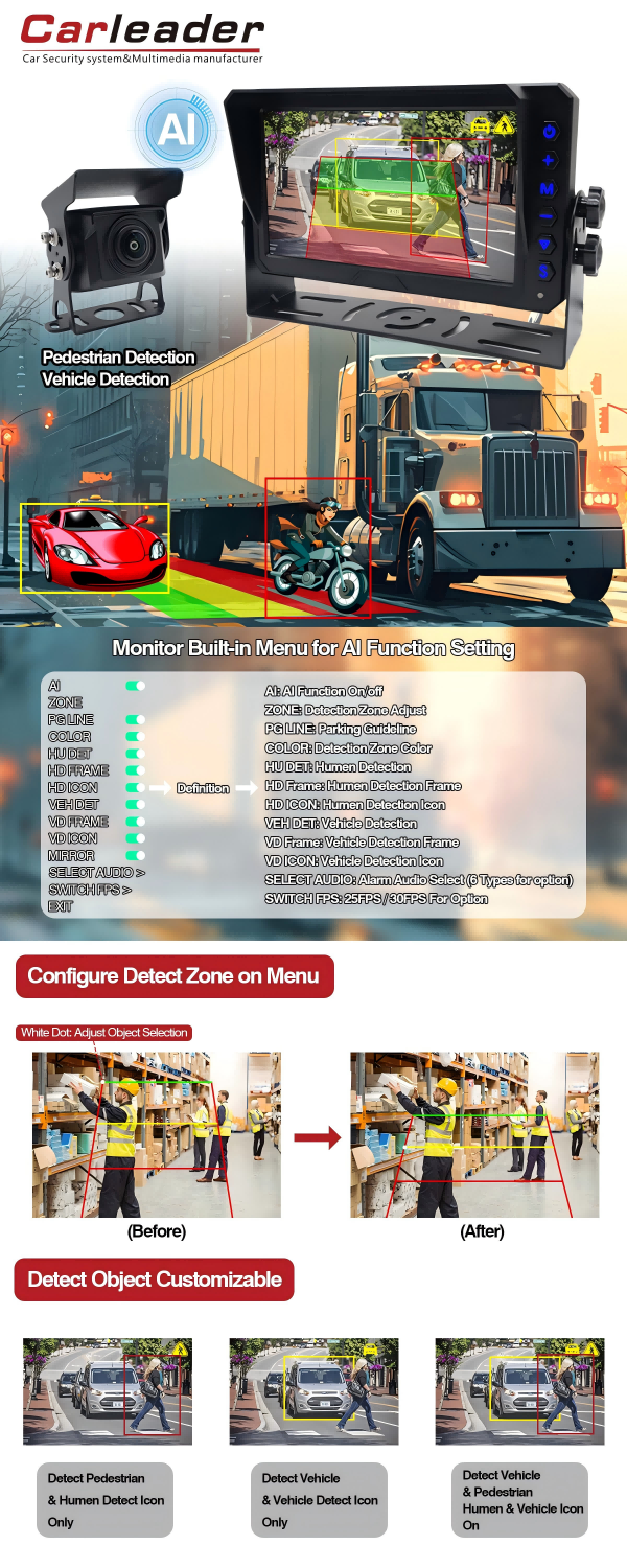Carleader 7 дюймдік AI BSD соқыр дақтарды анықтау мониторингі жүйесін қолдау AI калибрлеу жетілдірілген AI жоғары дәлдік алгоритмдерімен және пайдаланушыға ыңғайлы мәзір cz жұмысымен жасалған. Бұл AI камера жүйесі жүргізушілерге кез-келген ауа-райы, жоғары дәлдіктегі жаяу жүргіншілер мен көлік құралдарының динамикалық ескертулерімен қамтамасыз етіп, жол-көлік оқиғаларының қаупін тиімді төмендетеді. AI бақылау камера жүйесі жеке автокөліктерге, коммерциялық флоттарға және арнайы көліктерге жарамды. Флоттың AI жүйесі күшті интеграция мен үйлесімділікке, беріктікке және нақты уақыттағы бақылау мүмкіндіктеріне ие.