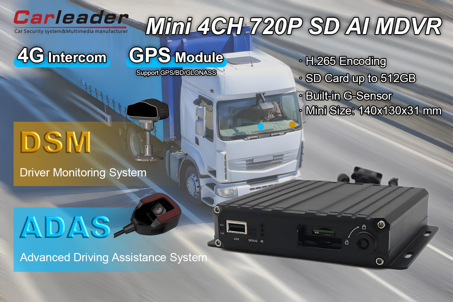 Carleader4CH AI ақылды мобильді DVR DSM және ADASEMENTING DVR және қоғамдық көлік, логистика және паркті басқару, құқық қорғау органдары, коммерциялық көліктер және көлік құралдарында сенімді бейнебақылауды қажет ететін кез-келген сценарий