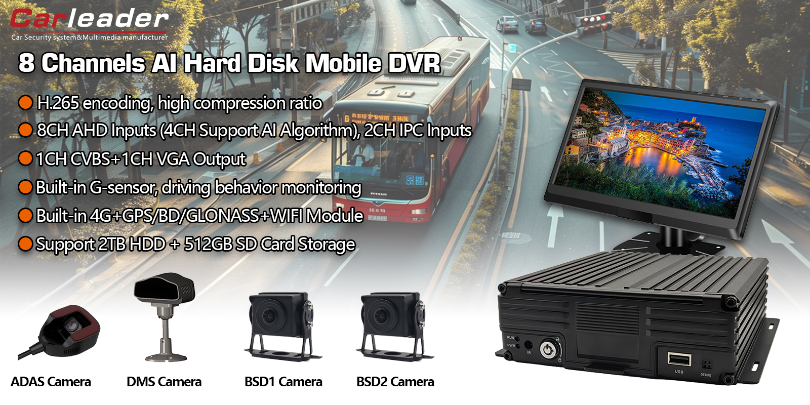 Carleader-мен таныстыру8CH AI HDD Mobile DVR ADAS+DMS+BSD қолдауы, 8 арналы жоғары деңгейлі қатты дискідегі сандық бейне жазу құрылғысы көліктерді кәсіби бақылауға және паркті интеллектуалды басқаруға арналған. ADAS, DSM, BSD қоса, жетілдірілген AI алгоритмдерімен сенімді аппараттық дизайнды біріктіру. Ол сенімді, жоғары сапалы бейне жазуды, жүргізушіге жан-жақты көмекті және қауіпсіздікті алдын ала бақылауды қамтамасыз етеді — барлығы бір, біріктірілген жүйеде.