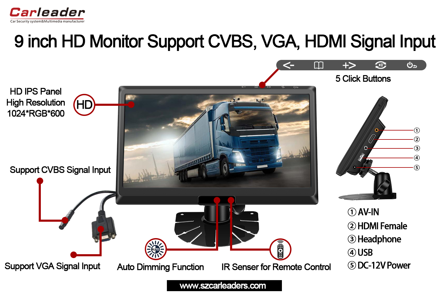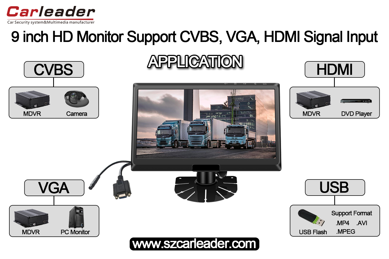 Карлидер9 дюймдік IPS экран HD мониторы CVBS+HD+VGA кірістерін қолдайдыКөлікті бақылауға және MDVR паркін басқаруға арналған жоғары өнімді HD мониторы. Автокөлік мониторы CVBS, HD және VGA сигнал кірістерін қолдайды. Ал MDVR VGA немесе HD интерфейсі болса, 9 дюймдік IPS экранды автомобиль мониторымен бірге пайдалануға болады.