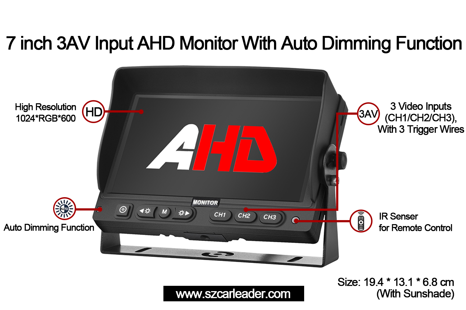 Автопаркты басқару, қауіпсіздікті бақылау немесе өнеркәсіптік пайдалану үшін өте қолайлы, Carleader7 дюймдік 3CH AHD кірістері Көлік құралының сақтық көшірме мониторысенімділікті, әмбебаптылықты және пайдаланушыға бағытталған инновацияларды жинақы түрде біріктіреді.