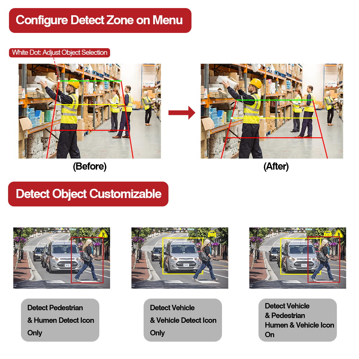 Кірістірілген ескерту шамы функциясы бар бұл AI камерасы анықтау нысаны әртүрлі анықтау аймағына (Қызыл, Сары, Жасыл) кіргенде, ашық түс сәйкес түске өзгереді. Сондай-ақ, жаяу жүргіншілер мен көлікке жақындаған көлікті қоршап тұрған дабыл сигналымен біріктіріңіз.