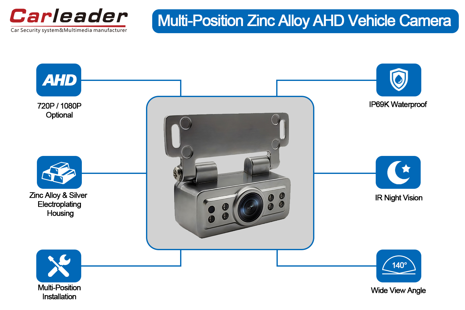 КарлидерAHD күміс электропластикалық көліктің кері камерасы5 дюйм, 7 дюйм, 9 дюйм немесе 10,1 дюймдік көлік мониторы үшін қолайлы. Жүргізушіге жақсы көру тәжірибесін қамтамасыз ететін және жол-көлік оқиғаларын болдырмайтын 140 градус кең көру бұрышы бар түнгі көру су өткізбейтін автокөліктің кері камерасы. Қажетті бұрышты реттей аласыз, содан кейін орнатуды аяқтау үшін гайкалар мен болттарды бекітіңіз. AHD 1080p сигналы жоғары ажыратымдылықтағы артқы көрініс камерасы анық сурет сапасына ие.
