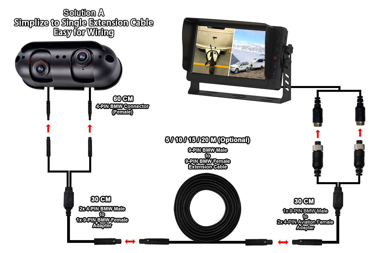 Бірінші шешім тек бір ұзартқыш кабельді (9-PIN BMW қосқышы), камера мен мониторды қосу үшін екі ұшына арналған 1-2 бөлгіш кабельді пайдаланады. Өйткені бұл шешім тек бізде ұзартқыш кабельде, бұл сымдарды қосу процесін жеңілдетеді және ыңғайлы етеді.