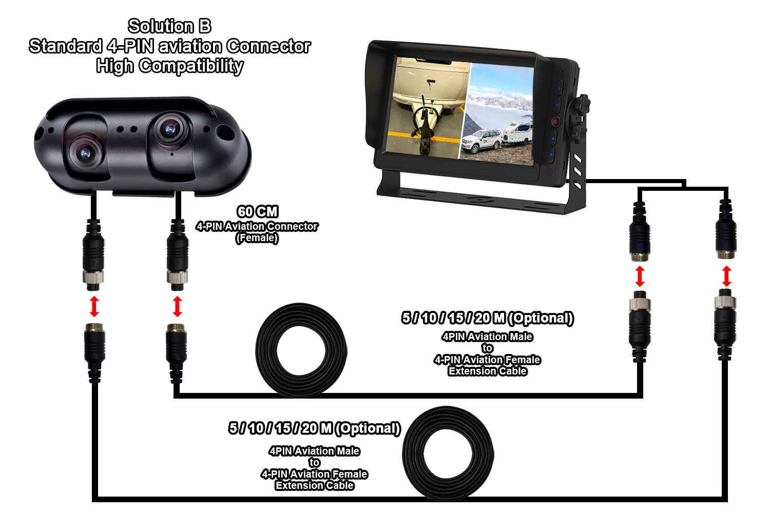 Екінші шешім екі ұзартқыш кабель болады, бірақ камера анықтамасы стандартты 4-PIN авиация қосқышы болып табылады, ұзартқыш кабель стандартты 4-PIN авиациялық қосқыш болғанша, ол ұзартқыш кабельмен үйлесімді болады.