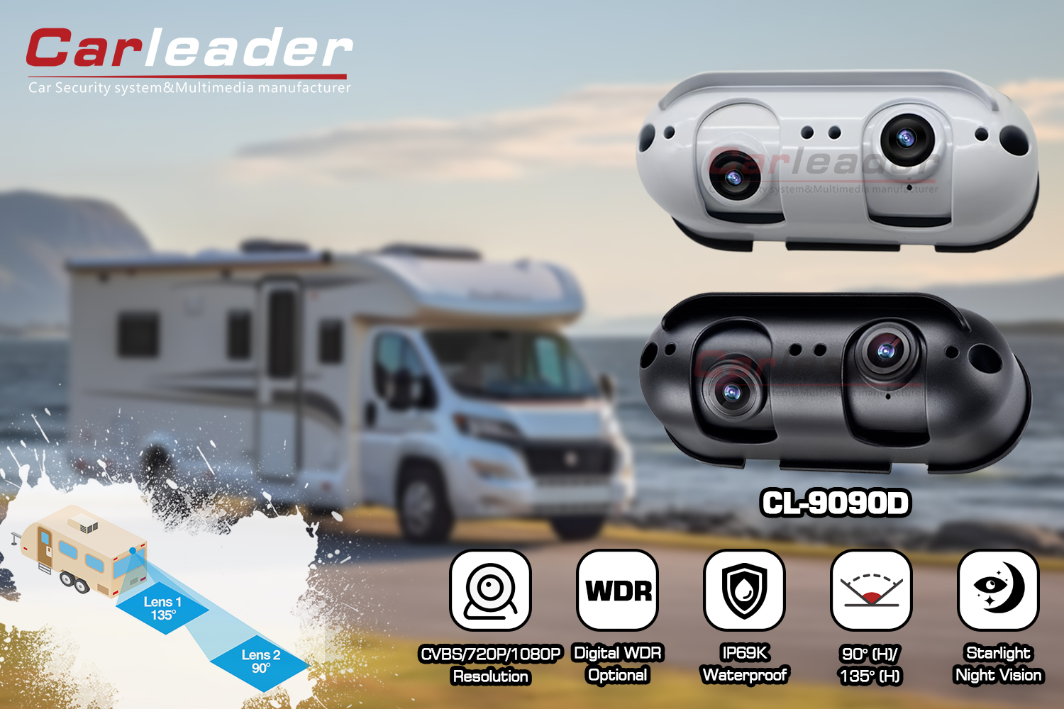 КарлидерAHD жұлдызды жарық қос линзалы артқы көрініс камерасы RV автокөлігіне жарамды, Carleader компаниясының жеке аспаптық AHD артқы көрініс камерасы, қос линзаның дизайны пайдаланушыға жақын және алыс қашықтықтағы артқы көріністің анық көріну өнімділігіне мүмкіндік береді. Оның алюминий қорытпасынан жасалған корпусы және IP69K рейтингі кез келген қатал ауа-райында камераны берік және берік етеді. Бұл камера жүк көлігі, автобус, жүк көтергіш және т.б. сияқты ауыр жүк көліктеріне ғана сәйкес келмейді; RV және керуен сияқты моторлы көліктерге де жарамды.