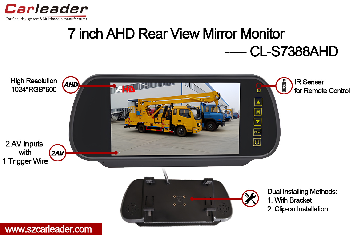 Карлидер7 дюймдік TFT LCD артқы көрініс айнасы AHD мониторықазіргі заманғы көлік құралдарын бақылау жүйелері үшін ерекше айқындық пен әмбебаптық беруге арналған жоғары өнімді 7 дюймдік автокөлік айнасы AHD мониторы. Жетілдірілген мүмкіндіктерді пайдаланушыға ыңғайлы дизайнмен үйлестіре отырып, бұл монитор әртүрлі жүргізу жағдайында сенімді өнімділікті қамтамасыз етеді.